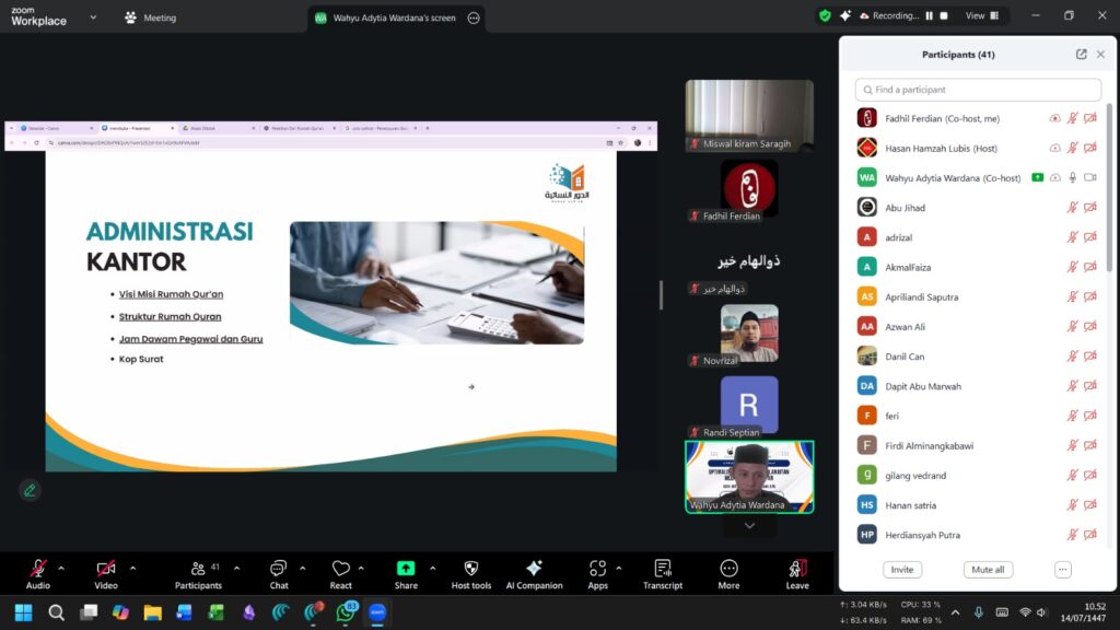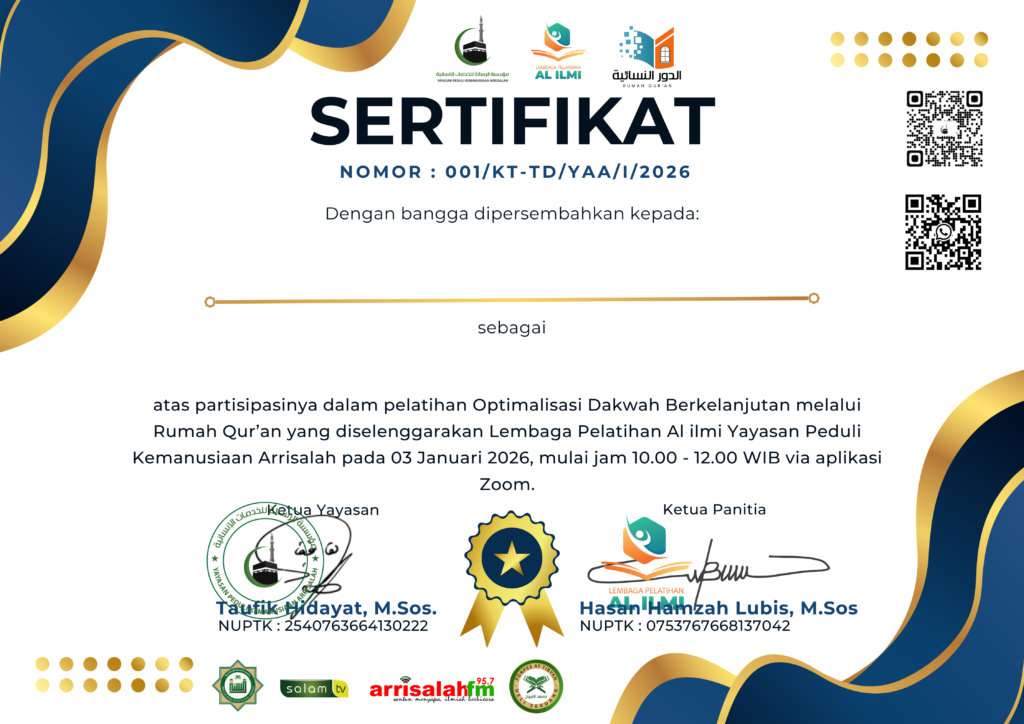 Lebih lanjut, pelatihan ini juga mengupas pentingnya profesionalitas dalam pengelolaan lembaga. Ustadz Wahyu menjelaskan bahwa keberhasilan sebuah Rumah Qur’an bergantung pada manajemen yang kuat, mulai dari penyusunan visi-misi yang jelas, struktur organisasi yang fungsional, hingga penerapan kurikulum yang terukur seperti metode Tahsin dan Tahfidz. Dengan adanya sistem administrasi dan evaluasi yang tertata rapi, diharapkan dakwah melalui Rumah Qur’an tidak hanya menjadi tempat belajar mengaji, tetapi berkembang menjadi pusat peradaban ilmu syar’i yang unggul dan berkualitas di masa depan.